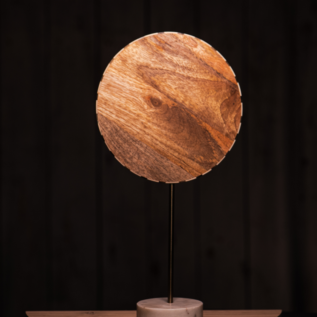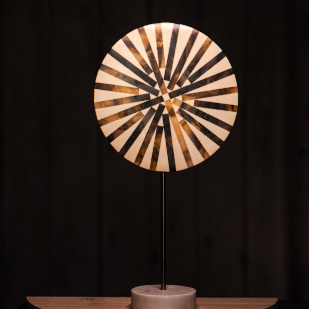 Visapusiškai užbaigtas iš visų pusių – spalvingas centrinis akcentas, įkūnijantis modernistines formos ir spalvos idėjas. Šią polichromu dažytą skulptūrą papildo smeigtuko formos rato dizainas, ruda medinė nugarėlė ir balto marmuro pagrindas.